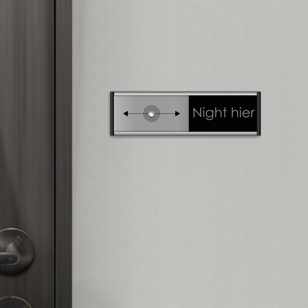 Das Schild besteht aus einem Aluminiumprofil und einer dazugehörigen Kunststoffplatte, so dass Sie den Status/die Botschaft des Raums leicht ändern können. Wählen Sie zwischen magnetischem oder doppelseitigem Klebeband + Schrauben.