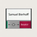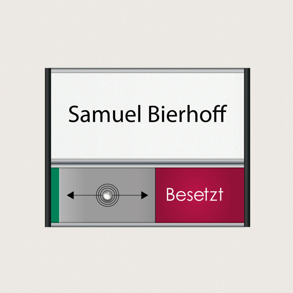 Türschild Büro mit Namen und Funktion Frei/Besetzt. Schreiben Sie den Namen der Person oder die Funktion des Raumes und zeigen Sie dessen Verfügbarkeit an.