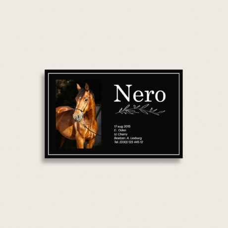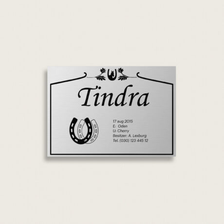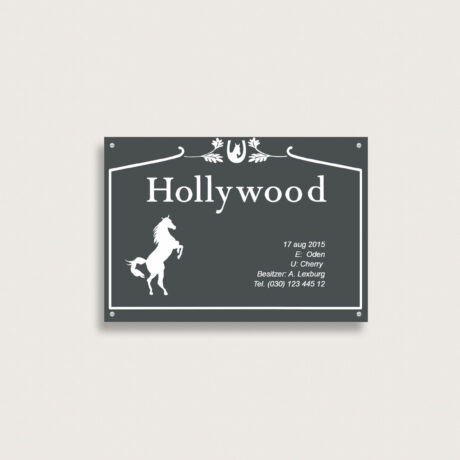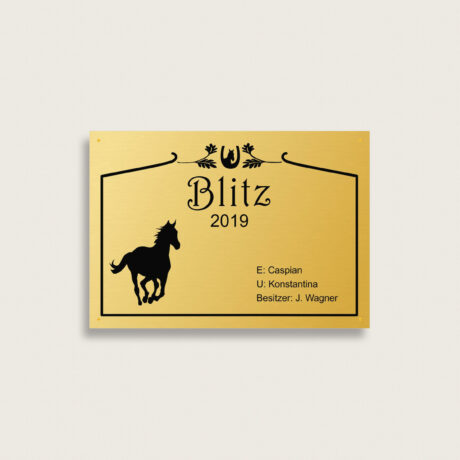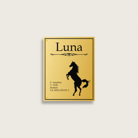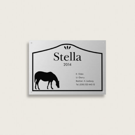 Boxenschild ideal für den Pferdestall, Reitverein oder Turniere. Gestalten und bestellen Sie Ihr individuelles Boxenschild einfach online. Hochwertige Materialien und schnelle Lieferung.